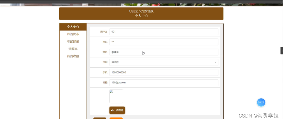 个人中心,在个人中心页面通过填写用户名、密码、姓名、性别、手机、邮箱等信息进行更新信息,并可对我的发布、考试记录、错题本、我的收藏进行相对应操作,如图5-6所示。