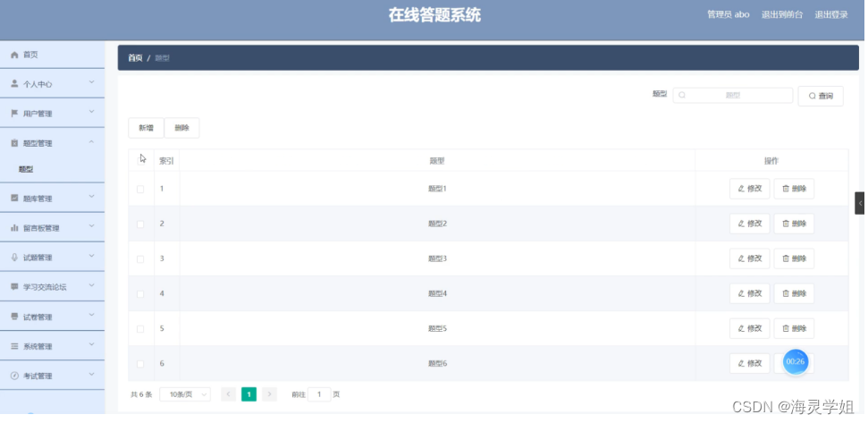 题型管理,在题型管理页面中可以查看题型等信息,还可以根据需要进行修改或删除等操作,如图5-10所示。