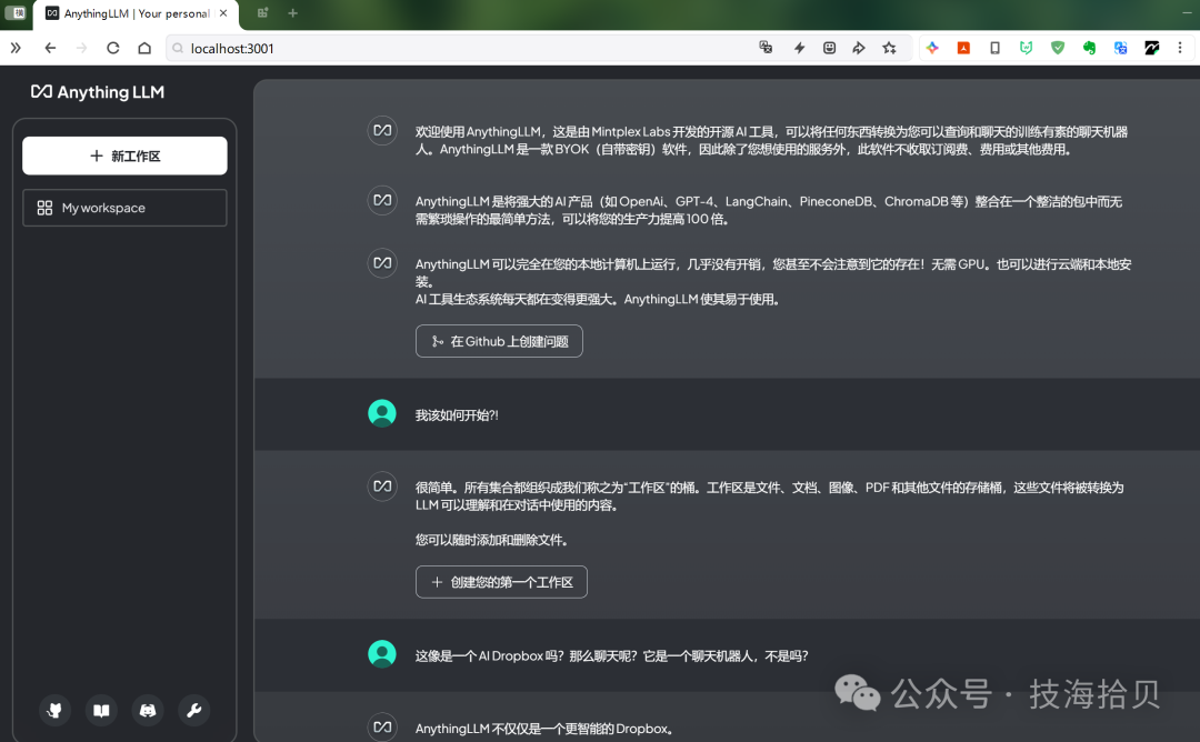 启动完成,通过浏览器打开如下网址:http://localhost:3001,进入AnythingLLM web界面