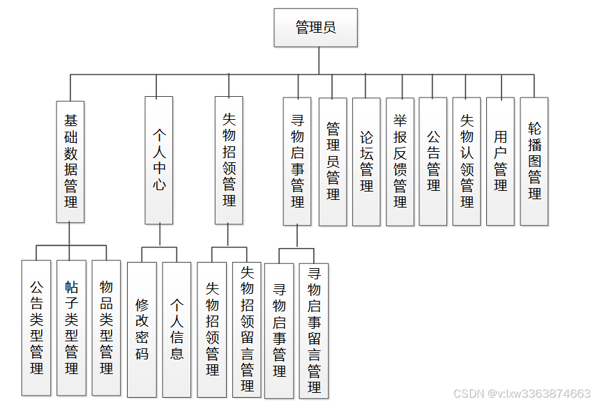 图4.1即为设计的管理员功能结构,管理员权限操作的功能包括管理失物招领信息,管理举报反馈信息,管理寻物启事信息,管理论坛,管理公告,管理失物认领信息等。