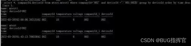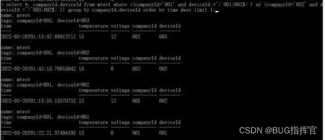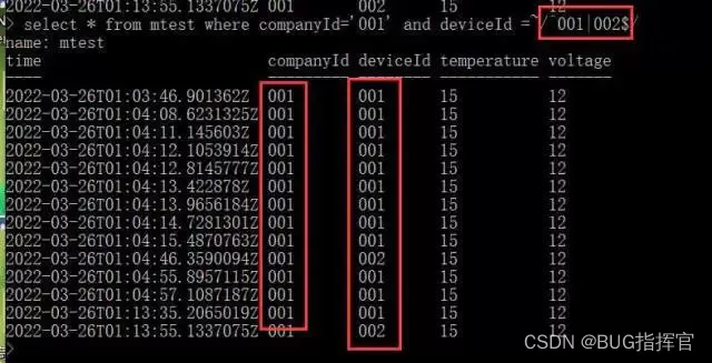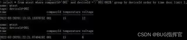 select * from mtest where companyId='001' and deviceId =~/^001|002$/;