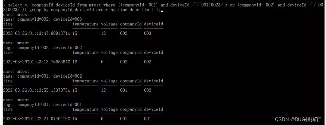 select * from mtest where ((companyId='001' and deviceId =~/^001|002$/ ) or (companyId='002' and deviceId =~/^003|002$/ )) group by companyId,deviceId order by time desc limit 1;