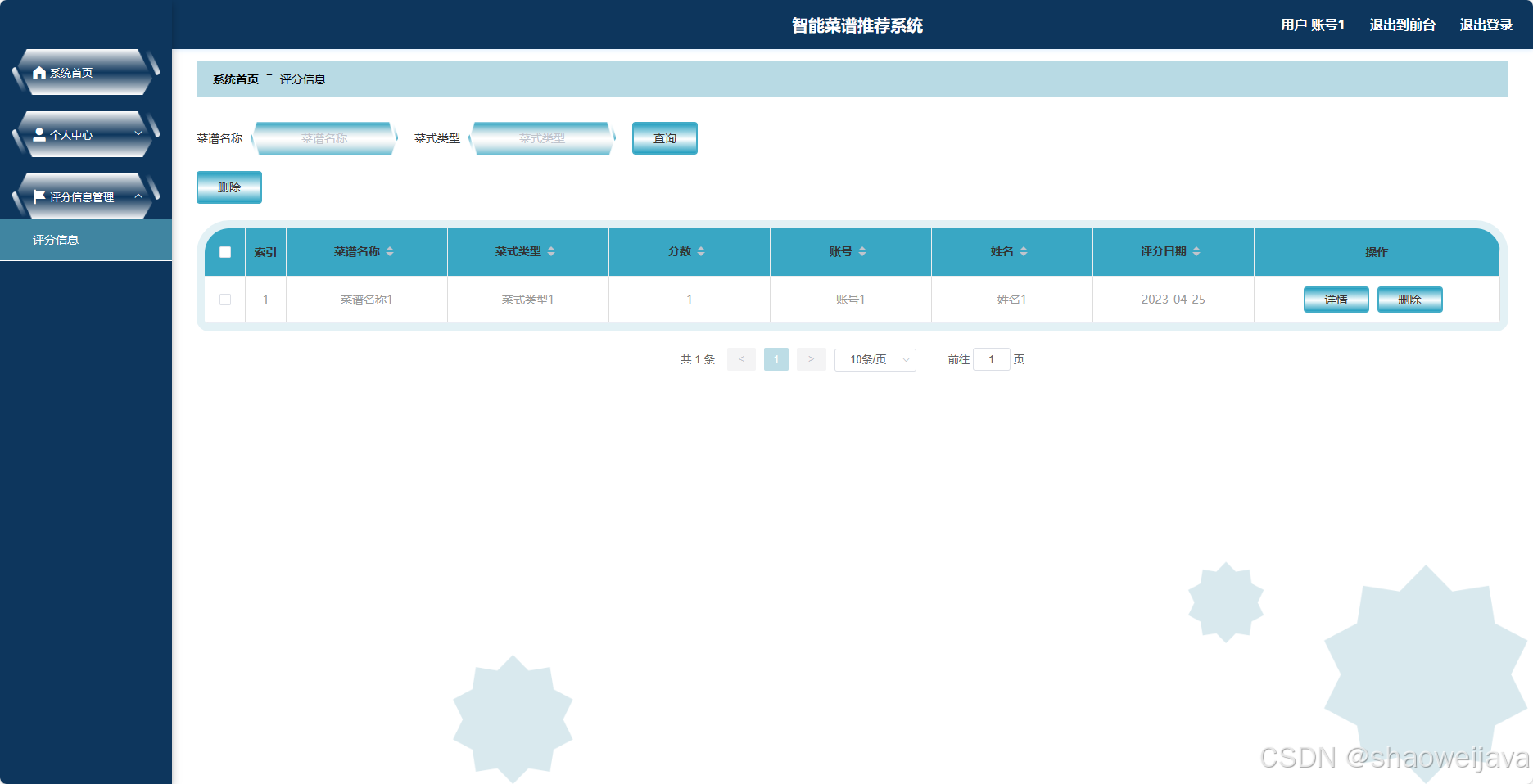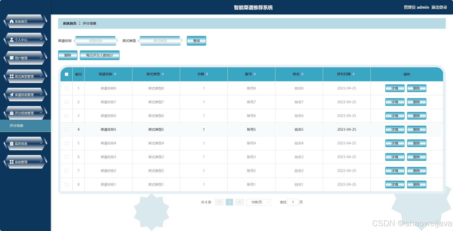 - 评分信息管理:管理员可以管理用户对菜谱的评分信息,包括查看和删除评分。