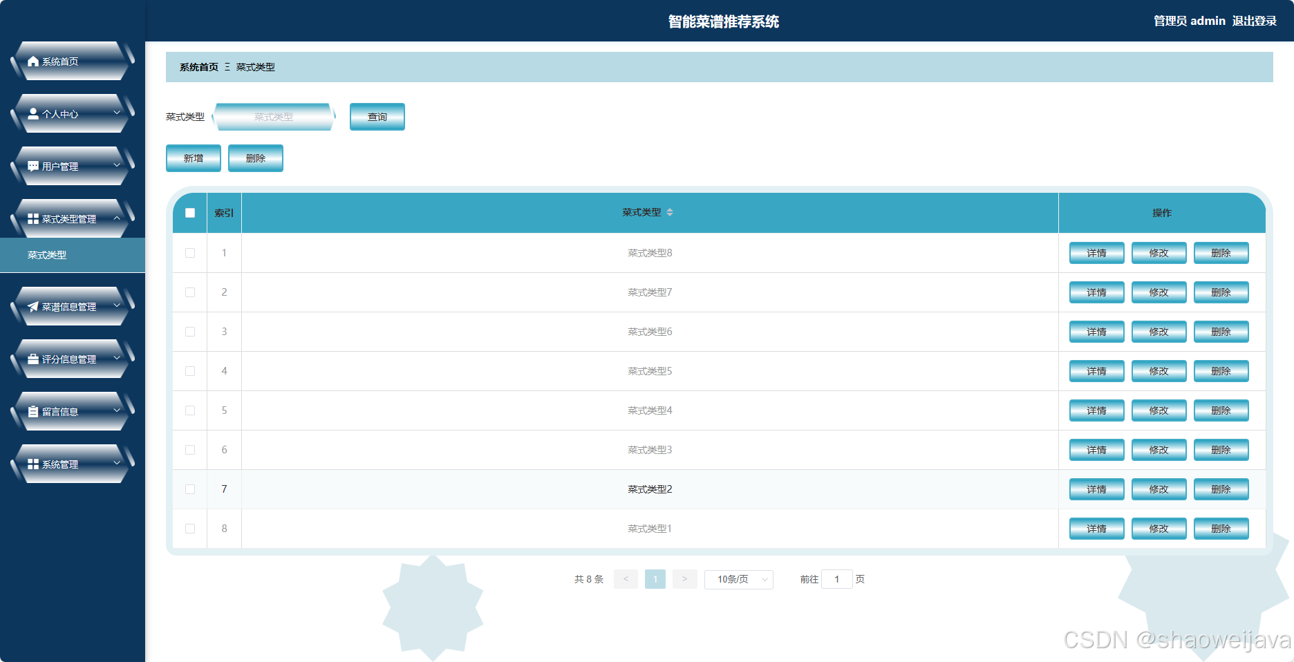 - 菜式类型管理:管理员可以管理菜式的分类信息,包括添加、编辑和删除分类。