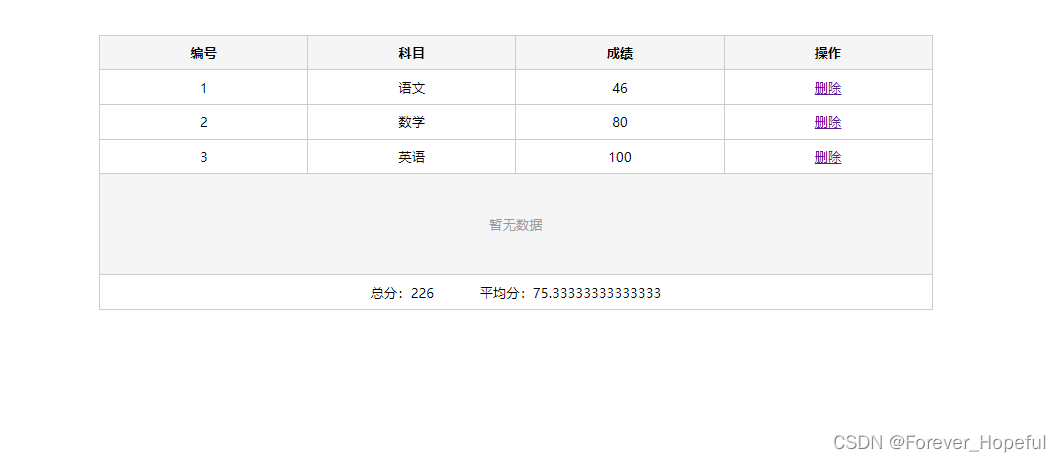 - 表格行要求 编号、科目、成绩、和 删除链接