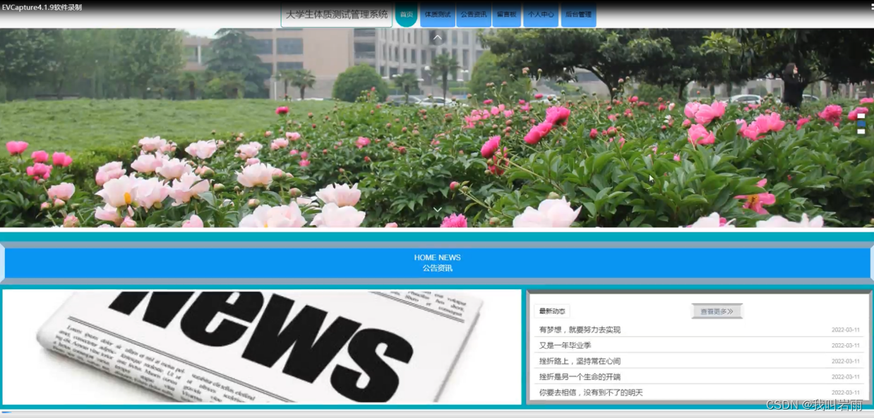 大学生体质测试管理系统,在系统首页可以查看首页、体质测试、公告资讯、留言板、个人中心、后台管理等内容进行详细操作,如图5-1所示。