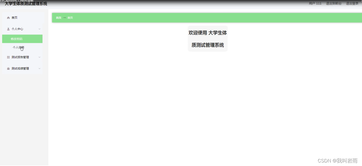 用户进入大学生体质测试管理系统可以查看首页、个人中心、测试报告管理、测试成绩管理等内容进行详细操作,如图5-14所示。
