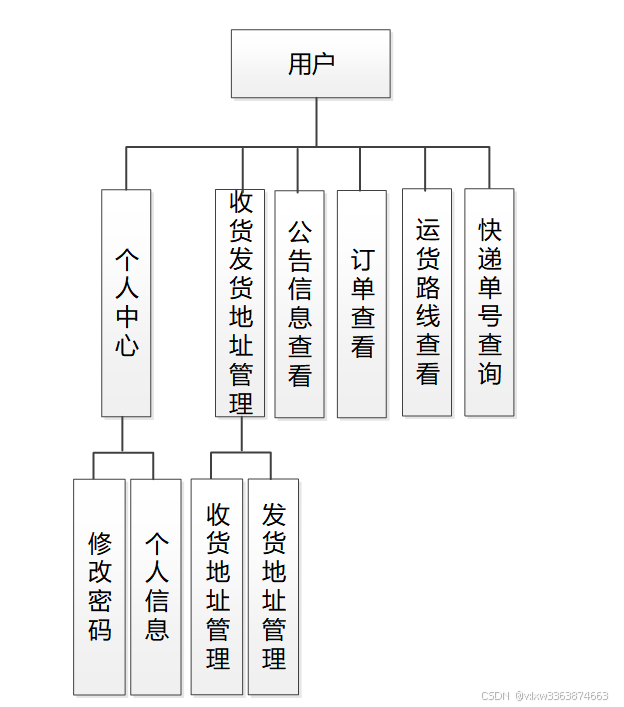 对用户具体功能的设计结果将以图4.2所示的用户功能结构图来进行体现。用户对于物流信息管理系统操作的功能包括查询快递,查看订单,查看运货路线,管理收货地址,管理发货地址,查看公告等。