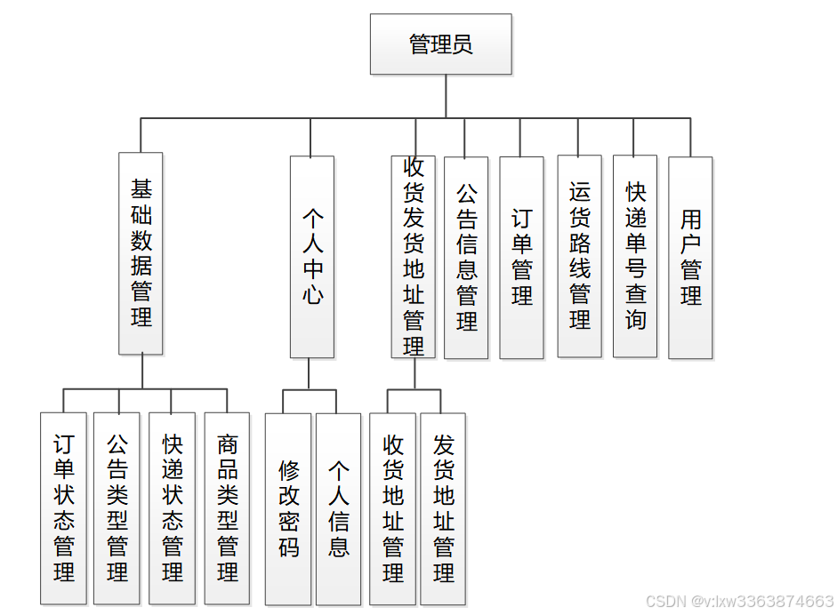 对管理员具体功能的设计结果将以图4.1所示的管理员功能结构图来进行体现。管理员对于物流信息管理系统操作的功能包括管理公告,管理收货地址发货地址信息,管理订单,管理快递信息,管理运货路线等功能。