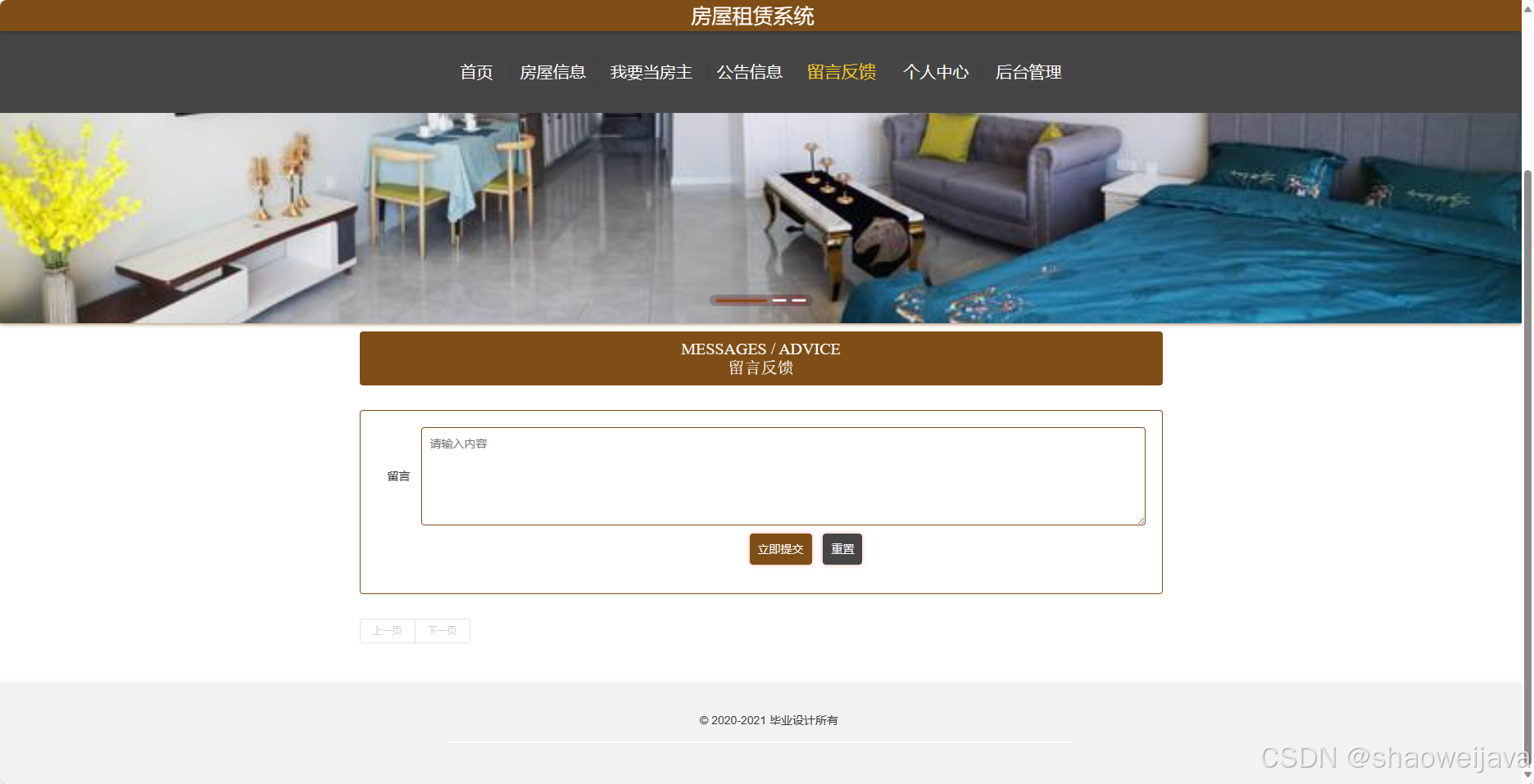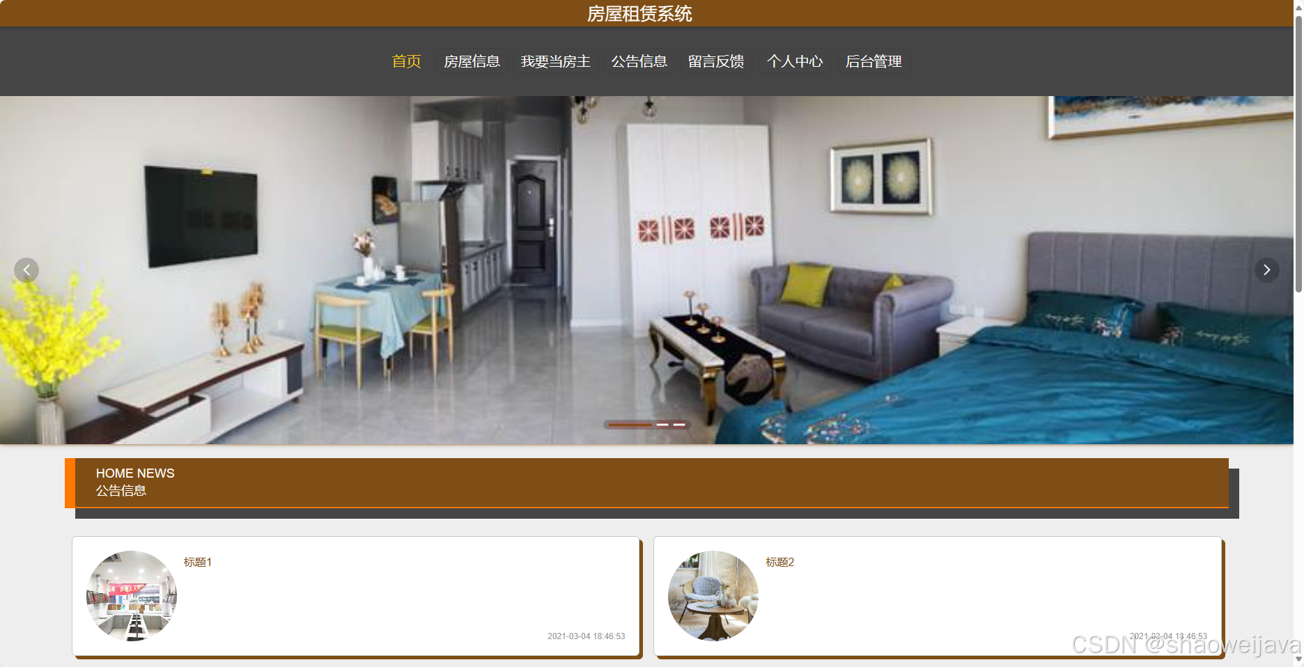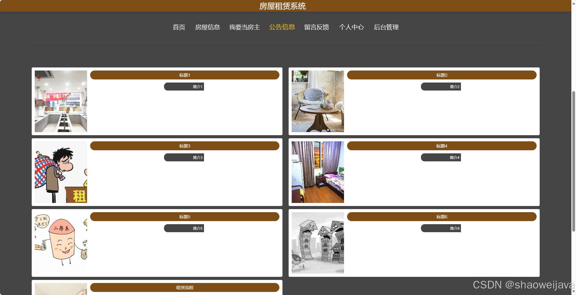 - 首页:展示房屋租赁系统的核心内容。