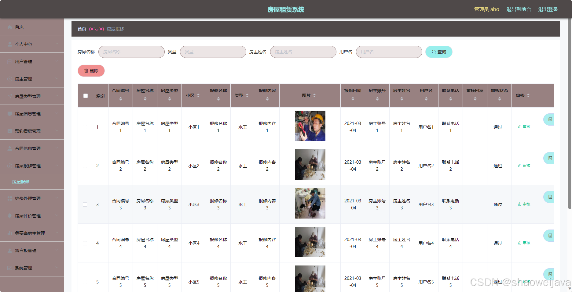 - 房屋报修管理:管理员可以管理用户的房屋报修信息,包括处理报修、记录维修进度等。