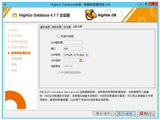 注意:加密设置需要设置LDAP服务器,此处默认不做任何勾选。