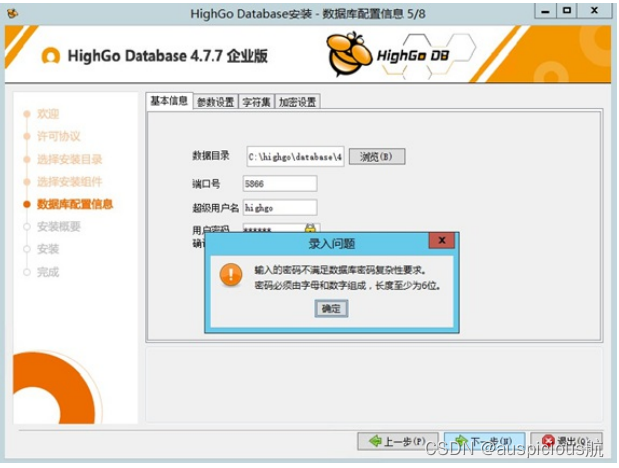 注意:数据库端口号默认为 5866,管理员用户默认为highgo,用户密码需由至少 6 位的