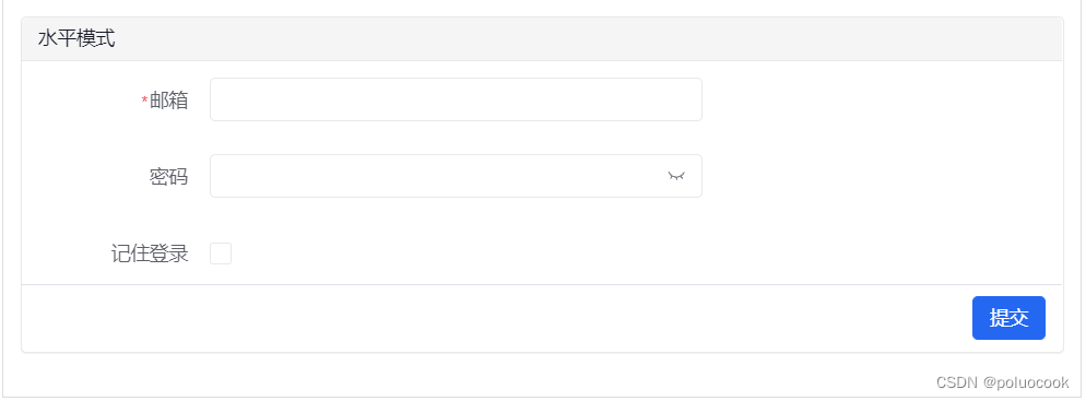 我们可以在mode中添加horizontal是表单水平,也可以通过配置horizontal的属性使其调整偏移量,格式如下: