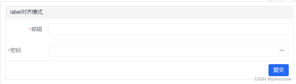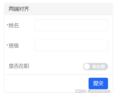通过上面的配置可以看出来水平布局其实按比率分配的。实际上有时候固定左侧宽度更好看点。 可以通过leftFixed进行改动配置 'xs' | 'sm' | 'md' | 'lg' 来定义左侧 label 的宽度。