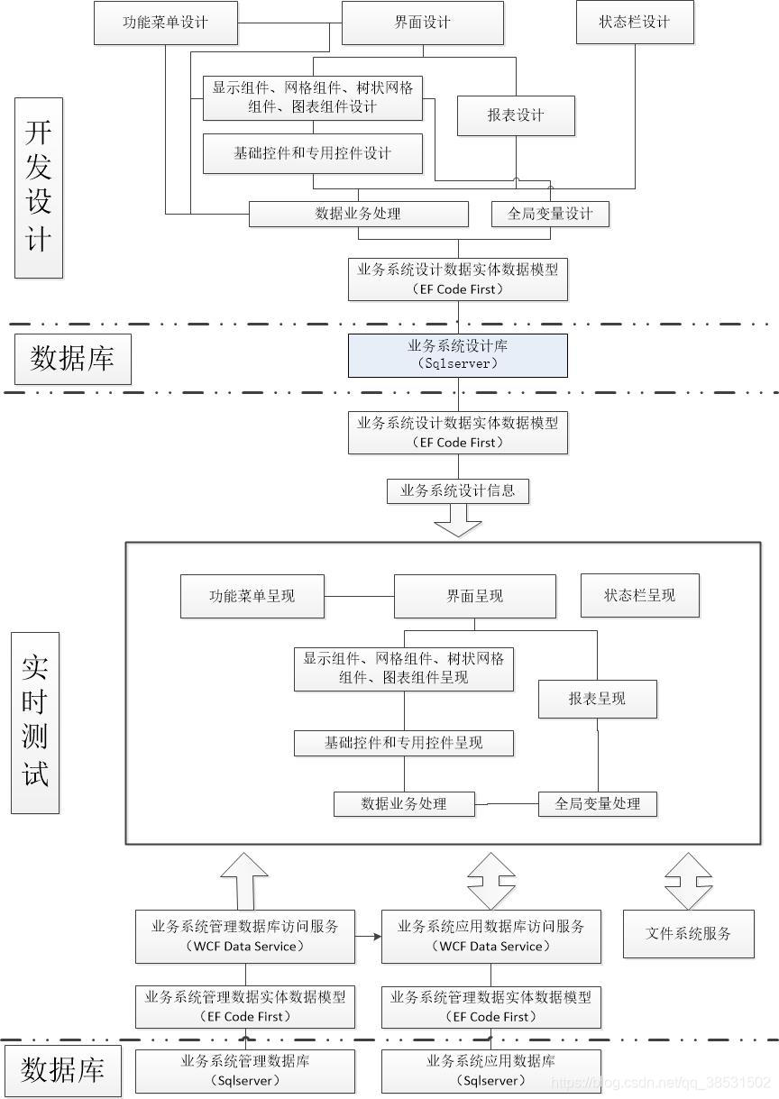 六、信管通低代码开发工具软件架构信管通低代码快速开发平台如下图所示。分为两部分的,一部分是开发设计,另外一部分是实施测试,业务系统开发人员使用开发设计部分先建立数据库,设计基础和专用控件,设计全局变量,然后设计显示组件、网格组件、树状网格组件、图表组件,如果有报表,则进行报表设计,这些设计完毕后再进行系统状态栏、界面设计和菜单设计。由于系统可以让多名业务系统开发人员使用,开发相同或不同业务系统,信