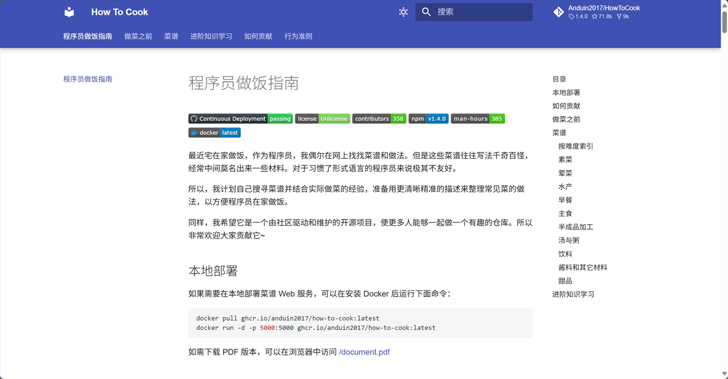 这是一个专为程序员设计的做饭指南,用清晰的结构化语言整理家常菜做法,像写代码一样严谨易懂。它解决了传统菜谱材料不清、步骤混乱的问题,适合厨房新手快速上手。项目包含近300道菜品,涵盖素菜、荤菜、主食到甜品,每道菜都有标准化材料和步骤说明,还配有难度分级和厨房基础知识。无论是煮泡面加蛋、煎牛排还是做提拉米苏,都能找到可复制的操作模板。特别适合工作忙碌的程序员在家高效做饭,也方便根据现有食材快速检索菜谱。所有内容由开源社区共同维护,不断更新实用菜式和烹饪技巧。