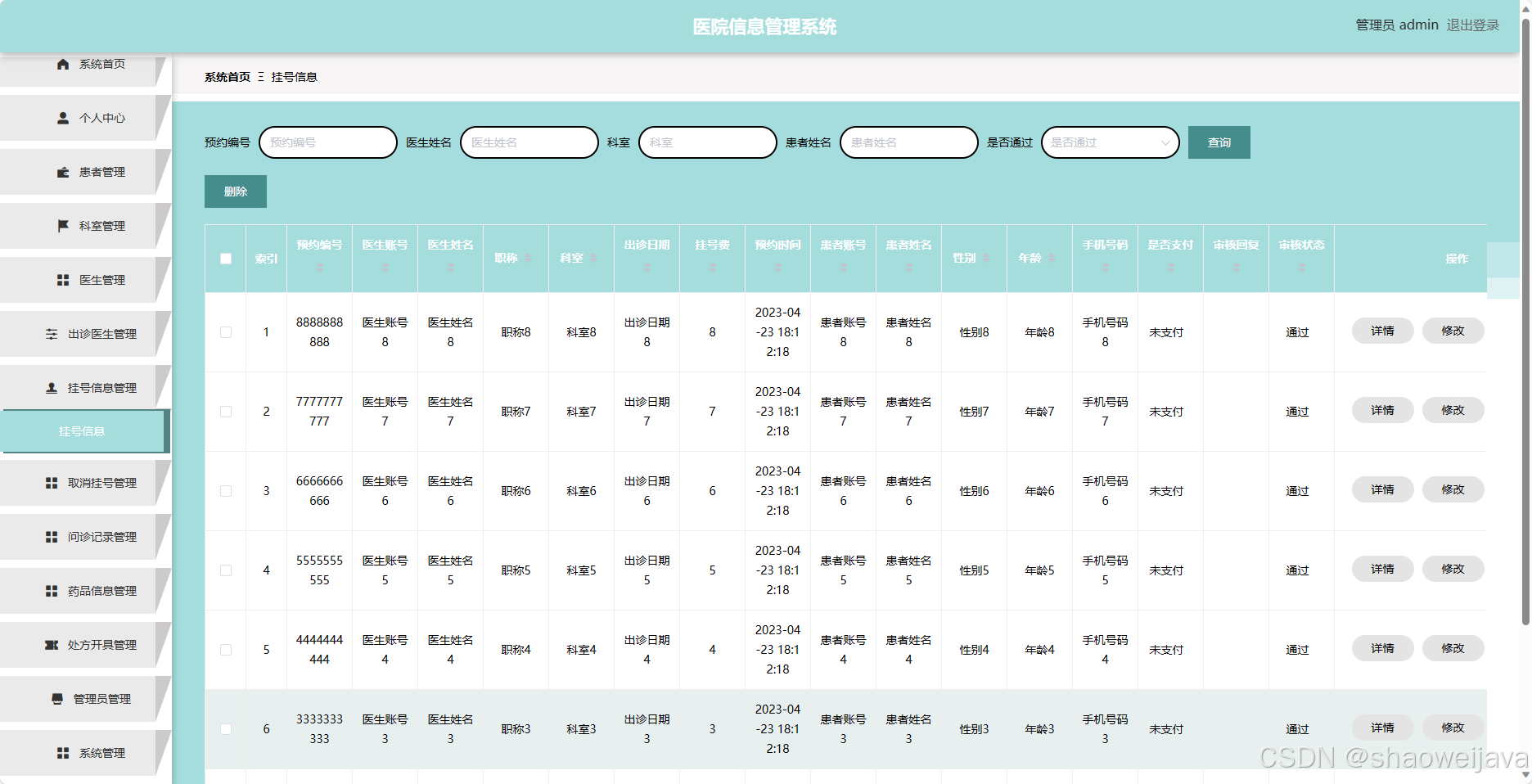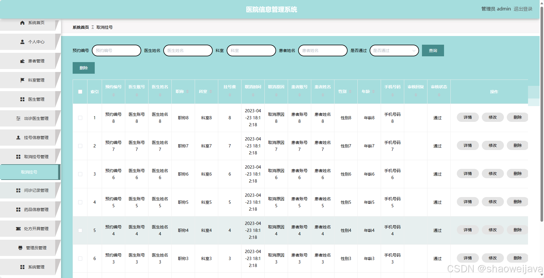 - 挂号信息管理:管理员可以管理患者的挂号信息,包括查看和取消挂号。