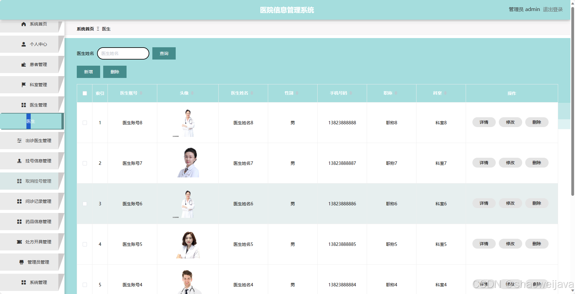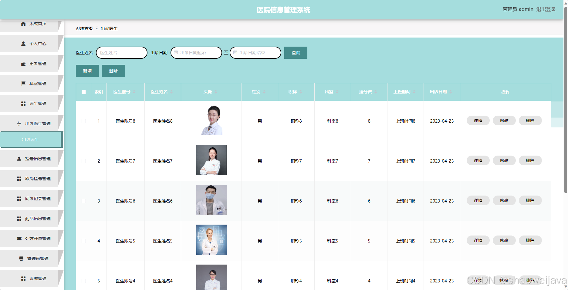 - 医生管理:管理员可以管理医生的信息,包括添加、编辑和删除医生信息。