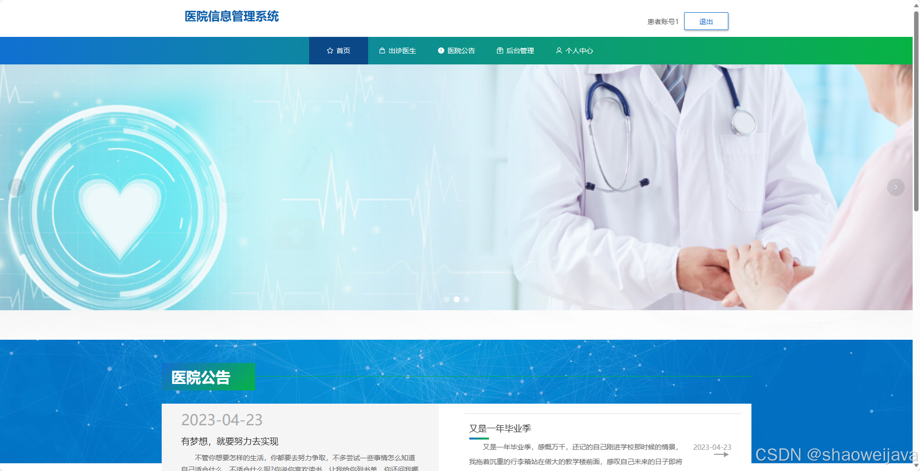 基于SpringBoot的医院信息管理系统,系统包含三种角色:管理员、医生、用户,系统分为前台和后台两大模块