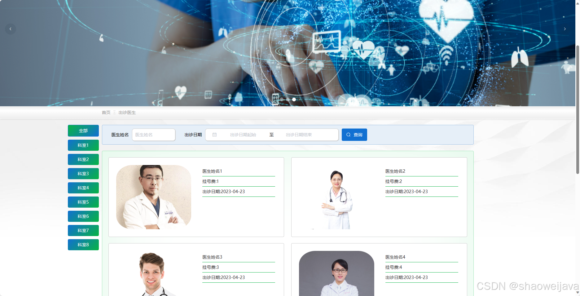 - 出诊医生:展示医院的出诊医生信息,包括姓名、职称、科室等。