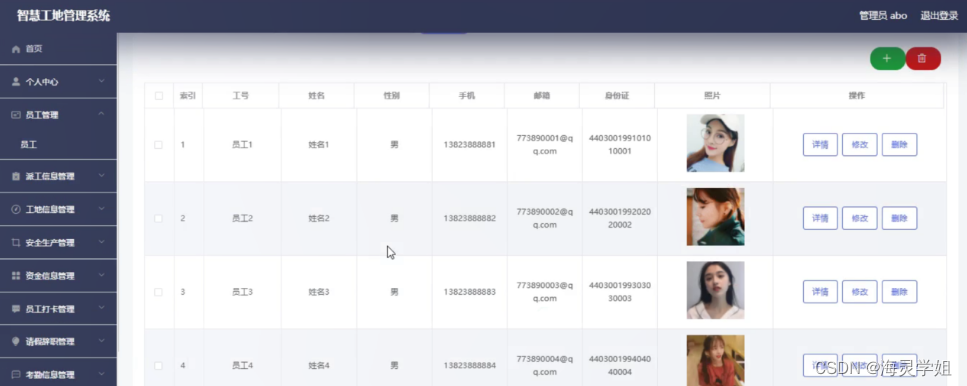 员工管理,在员工管理页面中可以对索引、工号、姓名、性别、手机、邮箱、身份证、照片等信息进行详情,修改或删除等操作,如图5-3所示。