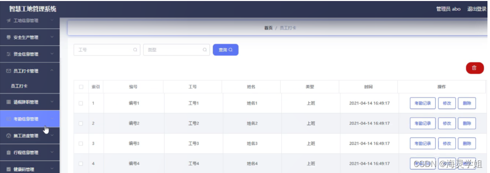 员工打卡管理,在员工打卡管理页面中可以对索引、编号、工号、姓名、类型、时间等信息进行考勤记录、修改或删除等操作,如图5-8所示。