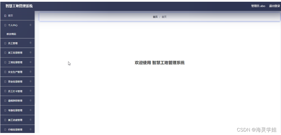 管理员登录进入智慧工地管理系统之后,就可以对所有的信息进行查看,可以查看到首页、个人中心、员工管理、派工信息管理、工地信息管理、安全生产管理、资金信息管理、员工打卡管理、请假辞职管理、考勤信息管理、施工进度管理、行程信息管理、健康码管理、视频监控管理、人员出入管理、车辆出入管理、模拟报警管理等,并且还可以对其进行相应的操作管理,如图5-2所示。