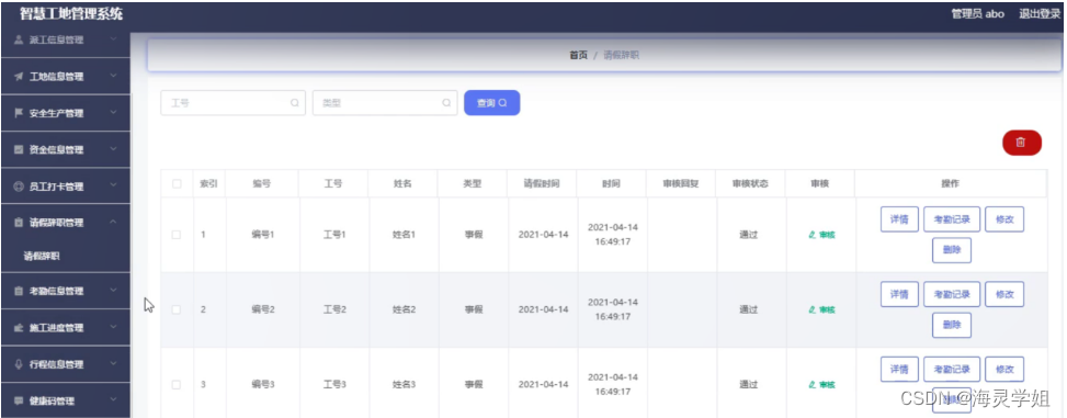 请假辞职管理,在请假辞职管理页面中可以对索引、编号、工号、姓名、类型、请假时间、时间、审核回复、审核状态、审核等信息进行详情、考勤记录、修改或删除等操作,如图5-9所示。