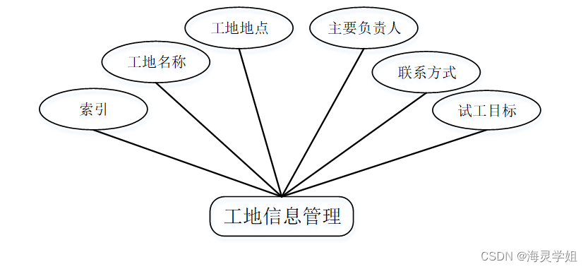 工地信息管理实体属性主要包括索引、工地名称、工地地点、主要负责人、联系方式、试工目标等属性。工地信息管理实体属性图如图4-6所示。