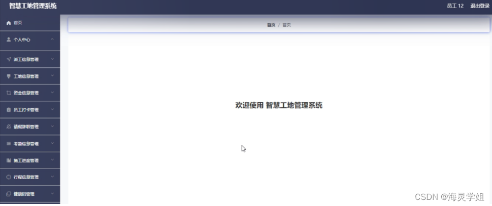 员工登录进入系统可以查看首页、个人中心、派工信息管理、工地信息管理、资金信息管理、员工打卡管理、请假辞职管理、考勤信息管理、施工进度管理、行程信息管理、健康码管理等内容,并且还可以对其进行相应的操作管理,如图5-12所示。