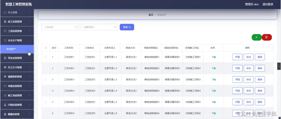 安全生产管理,在安全生产管理页面中可以对索引、工地名称、工地地点、主要负责人、联系方式、事故控制指标、隐患治理目标、文明施工目标、文件等信息进行详情,修改或删除等操作,如图5-6所示。