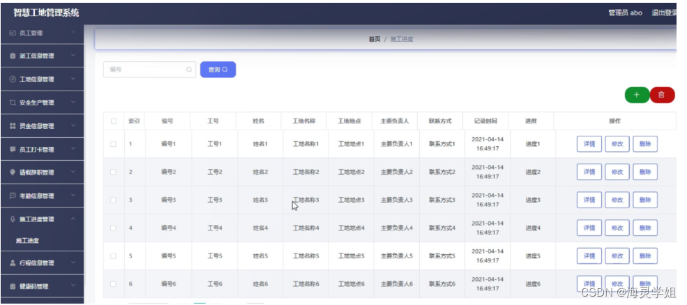 施工进度管理,在施工进度管理页面中可以对索引、编号、工号、姓名、工地名称、工地地点、主要负责人、联系方式、记录时间、进度等信息进行详情,修改或删除等操作,如图5-10所示。