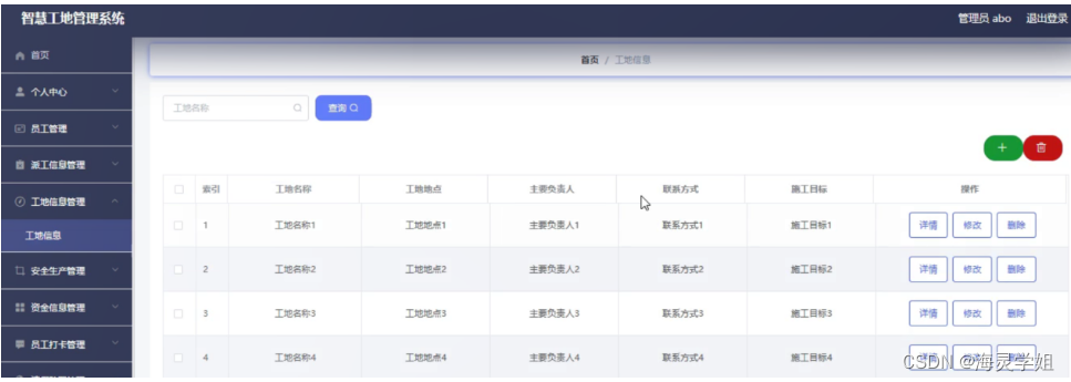 工地信息管理,在工地信息管理页面中可以对索引、工地名称、工地地点、主要负责人、联系方式、试工目标等信息进行详情,修改或删除等操作,如图5-5所示。