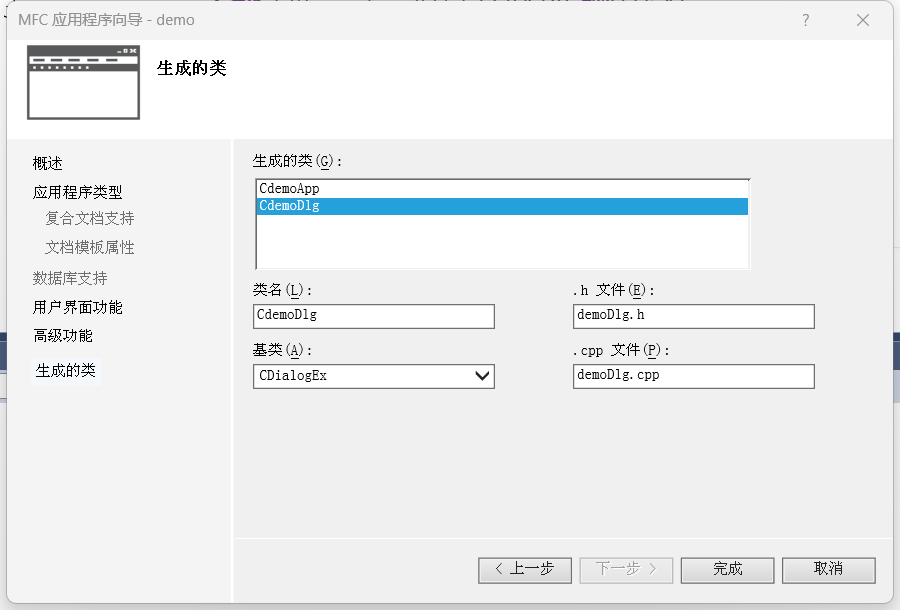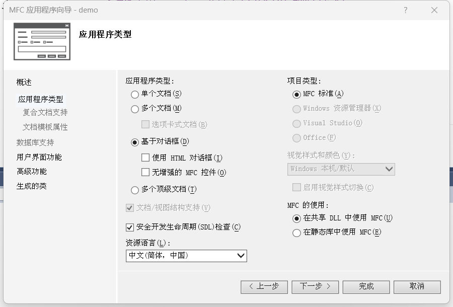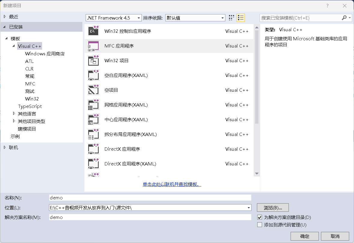 2.新建VC++项目,名称为demo,项目类别为MFC应用程序,并按以下图示进行配置,其余选项默认即可。