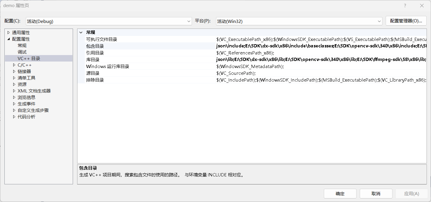 json\include;E:\SDK\dx-sdk\x86\include\baseclasses;E:\SDK\opencv-sdk\340\x86\include;E:\SDK\ffmpeg-sdk\58\x86\include; |