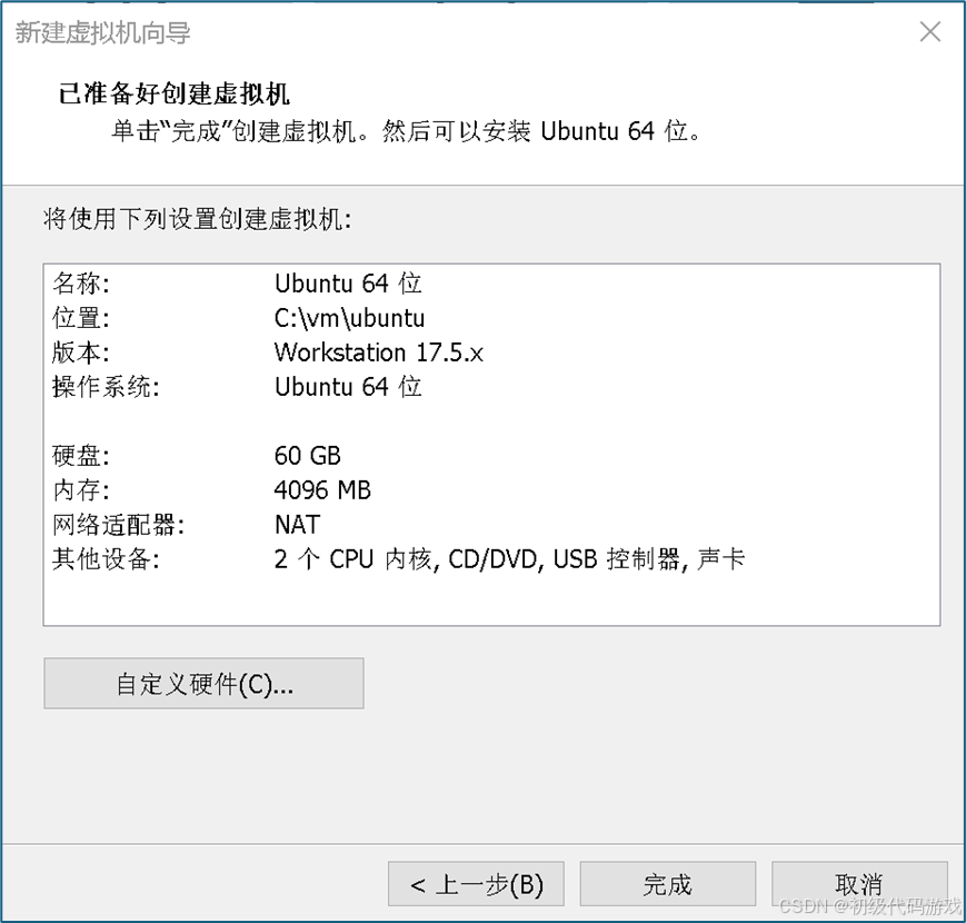 至此已经设置完成,可以现在自定义硬件,也可以创建完成后再配置: