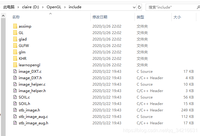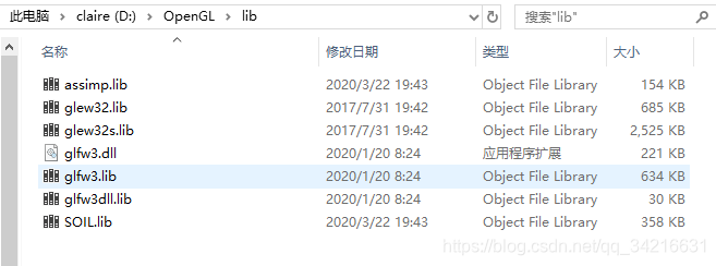①新建一个OpenGL的文件夹,里面创建两个小文件夹,分别叫做include和lib,然后把下载的glew和glfw的include文件家里的东西都放进新建的OpenGL文件夹中的include里面,lib文件夹也同理,这样有助于分类,类似于下面那样: