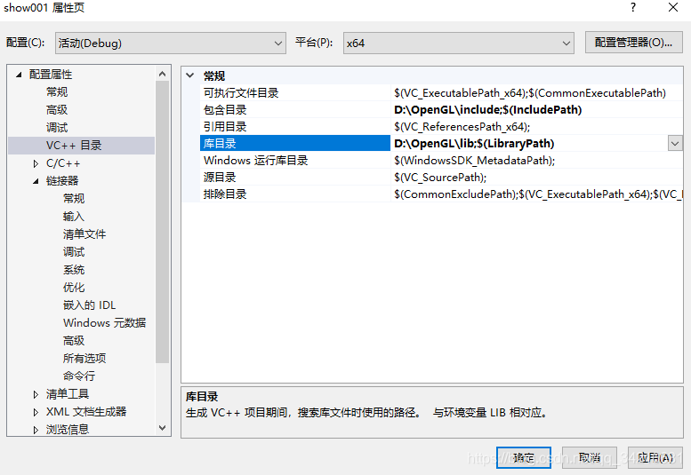 ③右击项目名,选择属性,更改包含目录和库目录,就是添加进去之前新建的OpenGL文件夹下的include和lib,结果如图