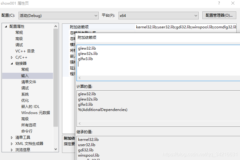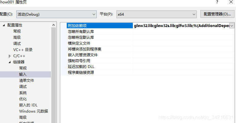 ④更改链接器-输入-附加依赖项-添加进去需要的lib,如图所示