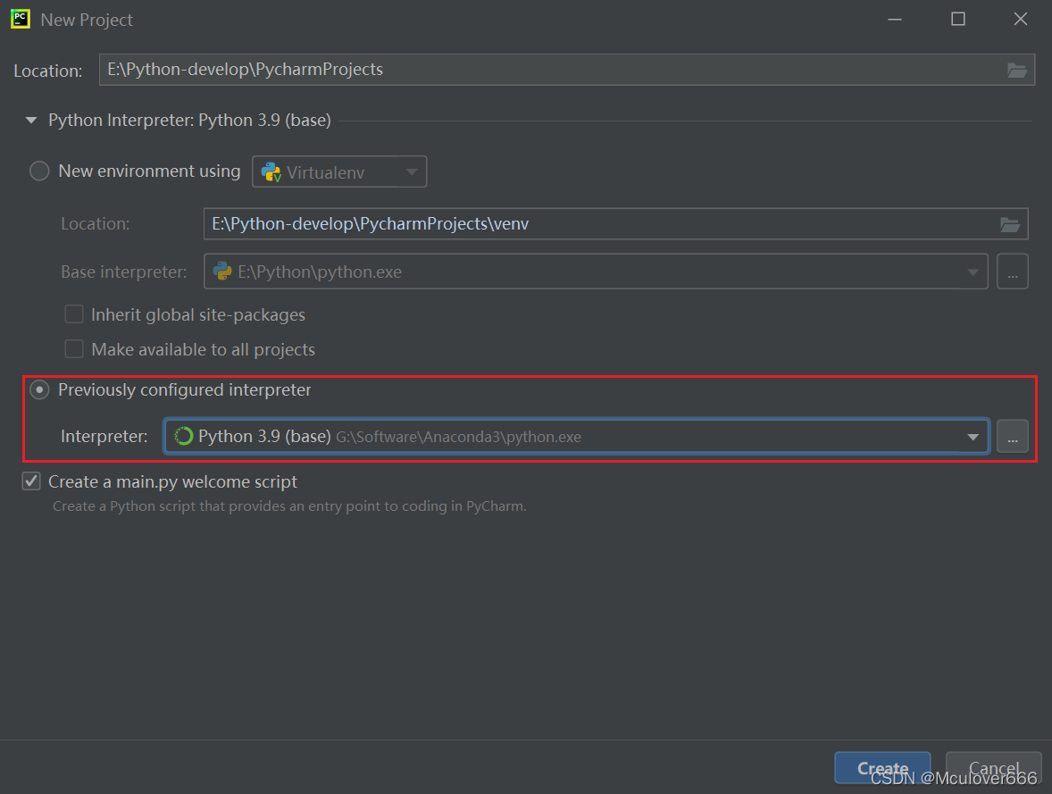 在Pycharm创建项目时,配置解释器为conda中的解释器: