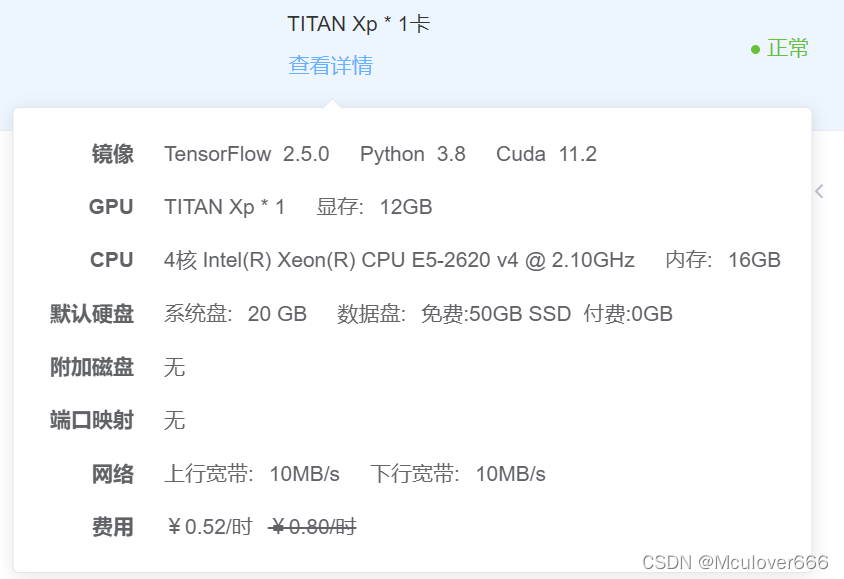 所以找到了一个云端GPU服务器租用平台(AutoDL),而且创建实例后默认已经装好了cuda、cudnn、python、tensorflow,开箱即用,爽的一批,推荐使用云端GPU环境。