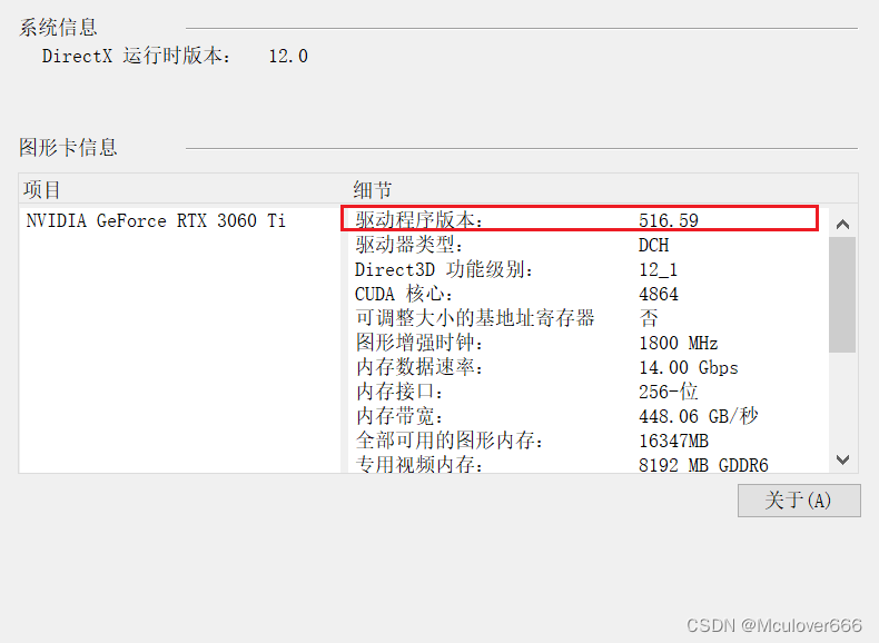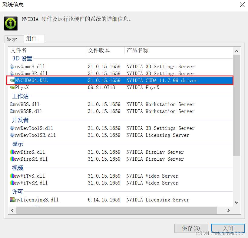 在【NVIDIA控制面板】->【系统信息】->【组件】界面,可以看到显卡最高支持的CUDA版本,这里我的破显卡RTX 3060 Ti 最高支持 cuda11.7版本: