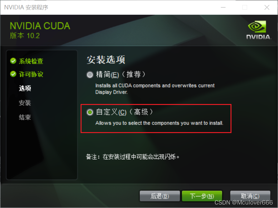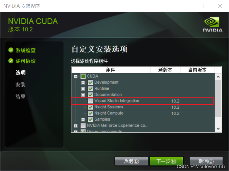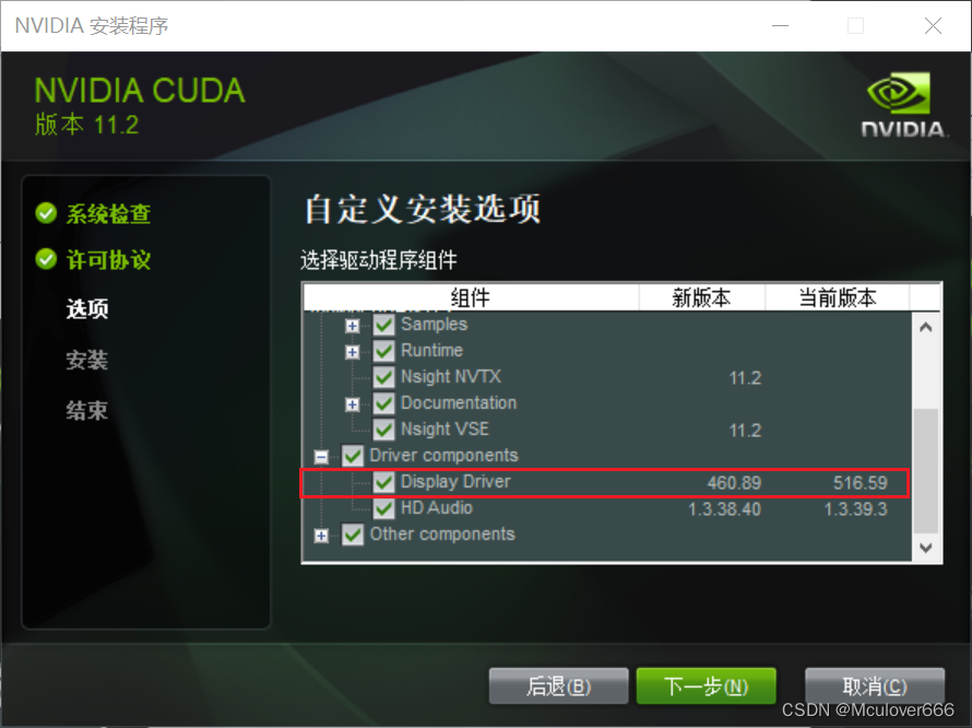 检查CUDA自带的显卡驱动版本与电脑当前版本号,如果低于则取消显卡驱动安装,否则显卡驱动安装会失败: