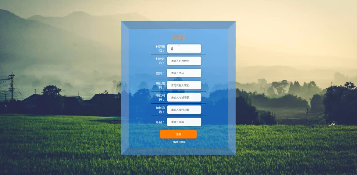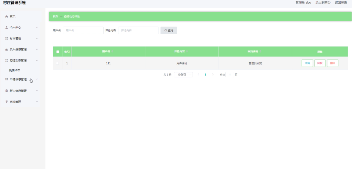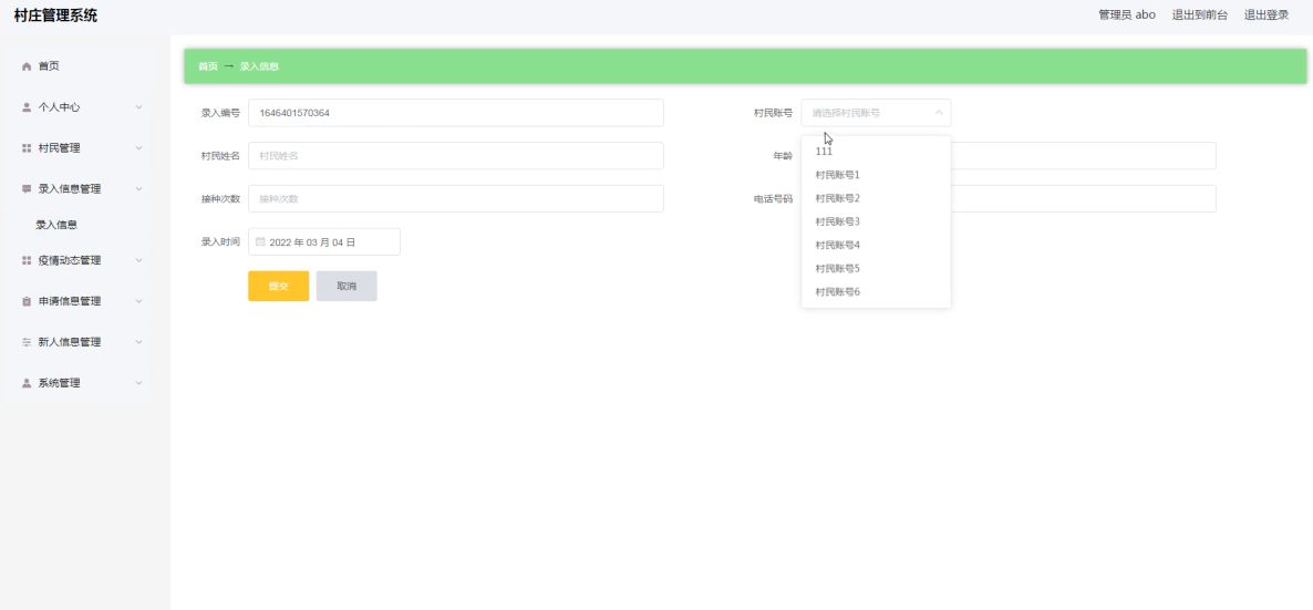 项目功能:村民,录入信息,疫情动态,申请信息,新人信息,村长,年龄段,年龄段统计,接种统计,疫情统计。