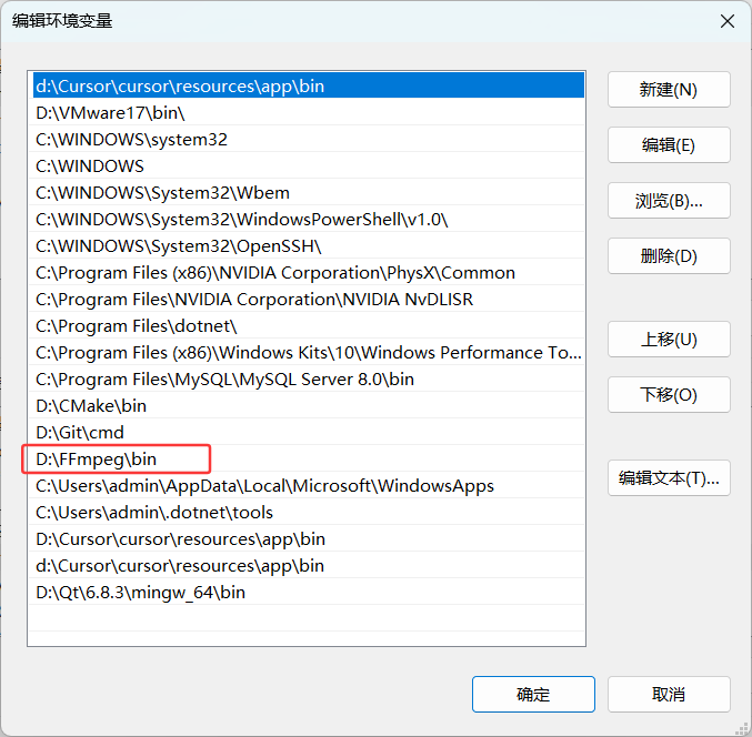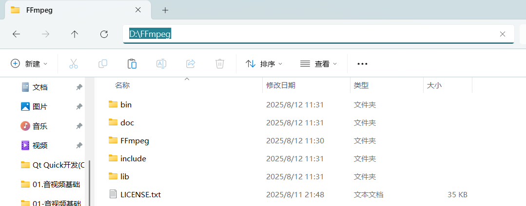这个包里包含了FFmpeg 64位版本的bin、include、lib文件,可以用来进行64位应用程序开发,下载后,解压到适合的地方,例如我直接解压到D:\。
