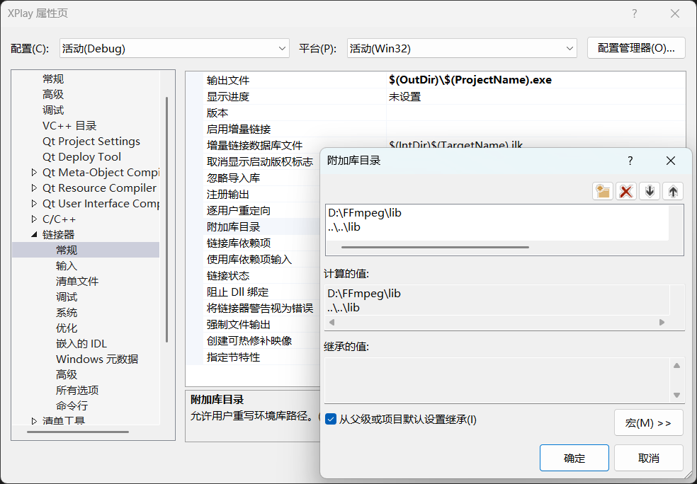 第二,设置链接器-常规-附加库目录,把FFmpeg的lib目录添加进去