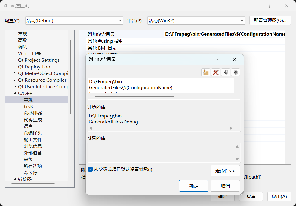 首先,设置C/C+±常规-附加包含目录,把FFmpeg的include目录添加进去