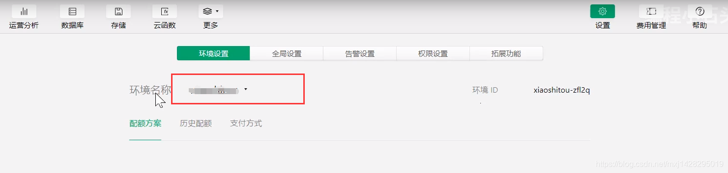 1.点击云开发,找到设置,复制环境名称(注意:第一次创建云开发环境最好选择按量付费)