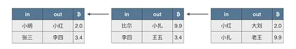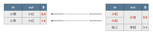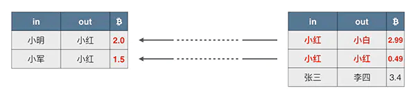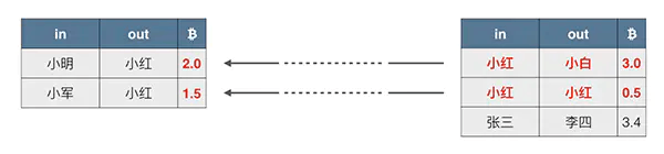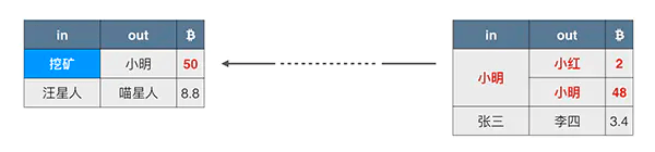 如果小明有50个比特币,他要转给小红两个比特币,那么剩下的48个比特币应该记录在哪?比特币协议规定一个输出必须一次性花完,所以,小明给小红的两个比特币的交易必须表示成:
